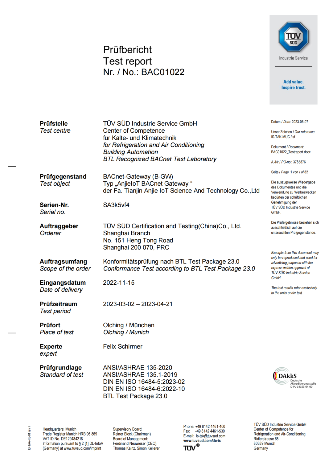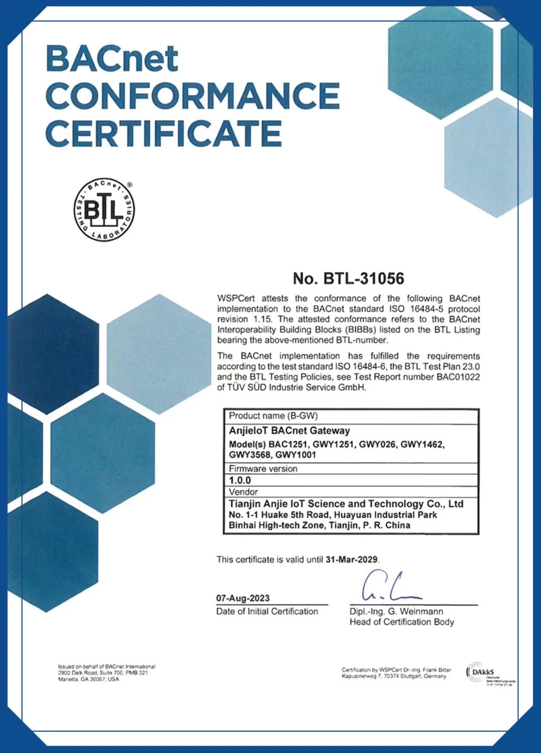 近日,由天津今年会jinnianhui物联科技股份有限公司自主研发设计的GWY系列智能网关产品成功通过BTL(BACnet Testing Laboratories )认证,该项认证是国际楼宇自控领域的第一权威认证。